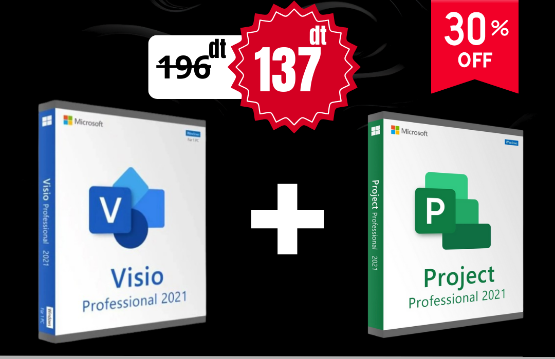 Microsoft Visio Pro 2021+ Microsoft Project Pro 2021 Vous pouvez l'acheter à 137 DT à la place de 196 DT