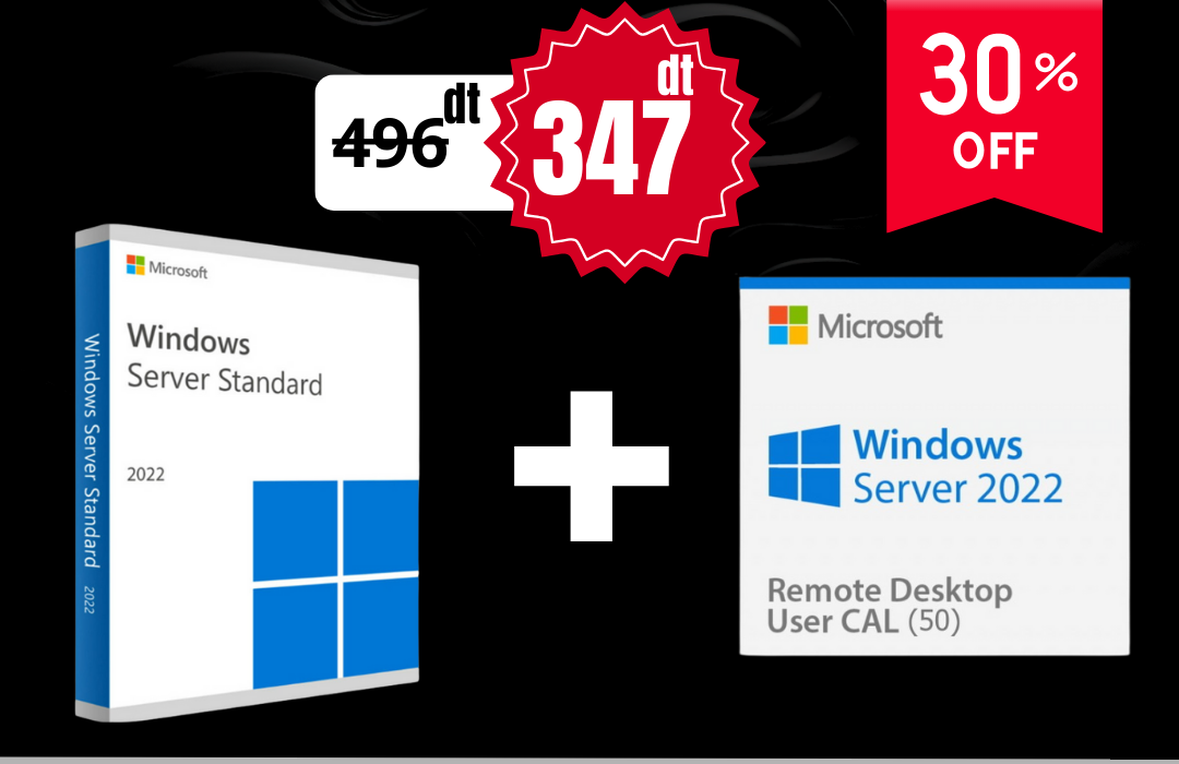 Windows Server 2022 Standard + Windows Server 2022 (RDS) 50 user Vous pouvez l'acheter à 347 DT à la place de 496 DT