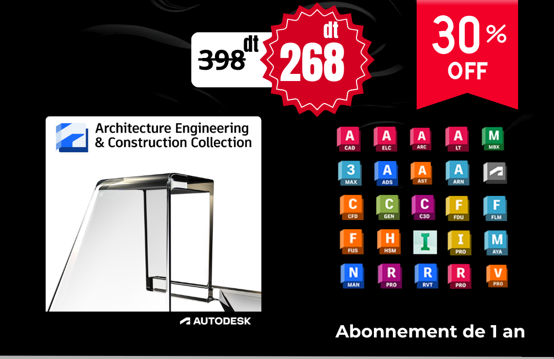 Autodesk AEC Collection avec 41 𝐥𝐨𝐠𝐢𝐜𝐢𝐞𝐥𝐬 Vous pouvez l'acheter à 268 DT à la place de 368 DT